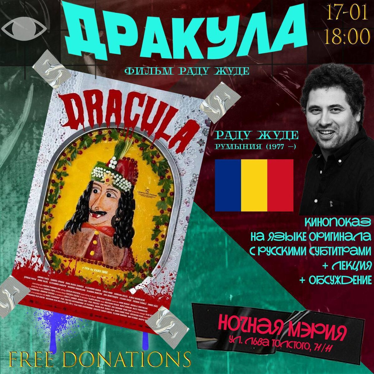 реж. Раду Жуде 🗓️ 17 января 18:00 📍 Льва Толстого, 71/11 (вход со двора) Жанр: авторское кино, сатира Хронометраж: 2 ч. 50 мин. Сюжет: вымышленный режиссёр Адонис Танта получает задание снять новую версию Дракулы с использованием искусственного интеллекта. Герой начинает создавать сцены с помощью генеративных моделей, получая визуальный поток сексуализированных и абсурдных образов. Новый фильм Раду Жуде — «Дракула» — радикальное и провокационное переосмысление классического мифа, в котором режиссёр использует фигуру вампира как инструмент критики истории, власти и коллективной памяти. Премьера была в Локарно, где многие кинокритики называли этот фильм одинм из сильнейших из программы. Как и в своих предыдущих работах, Жуде сознательно разрушает привычные жанровые ожидания, соединяя иронию, исторический анализ и жёсткий политический комментарий. Вместо готического романтизма зрителя ждёт фрагментированное повествование, насыщенное цитатами, визуальными коллизиями и намеренной ди