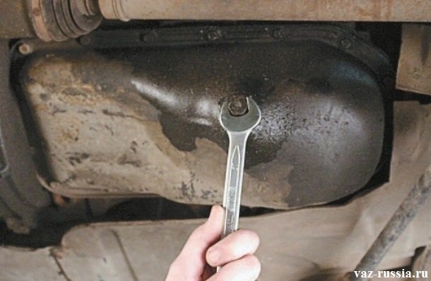 Снизу автомобиля подставьте емкость под сливное отверстие на картере.