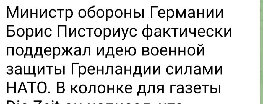 А кто защищал Гренландию от русских и китайцев неделю и месяц назад? Поможем Борису Писториусу вспомнить. - Гренландия - это часть Дании. - Дания - это часть блока НАТО. - В Гренландии расположена военная база США. - США - это член блока НАТО. Вопрос: так кто защищал Гренландию? Выходит, что НАТО. Что предлагает Писториус, с чем он согласился: НАТО должно взять на себя защиту Гренландии. Свежая, смелая мысль.