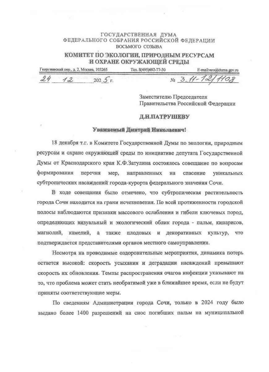 Всем, кого это касается и кого это волнует в Сочи. Продолжение разговора о судьбе субтропиков в Сочи, начатого вновь в ноябре-декабре 2025 года с запроса депутата Государственной Думы Константина Затулина в адрес руководителей Министерства природных ресурсов и экологии Российской Федерации, Россельхознадзора и Российской академии наук и проведение 18 декабря 2025 года круглого стола в Комитете