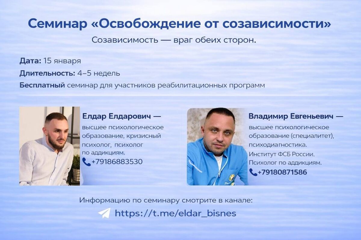 Семинар «Освобождение от созависимости» Созависимость — враг обеих сторон. С одной стороны, она поддерживает зависимость человека. Даже из любви. Даже с лучшими намерениями. Контроль и спасательство решают зависимого последствий. Но ведь только столкнувшись с последствиями, человек по-настоящему задумывается о выздоровлении. С другой, созависимые люди чаще страдают тревогой, депрессией и психосоматикой. Постоянное напряжение, вина и гиперконтроль разрушают изнутри. Поэтому лучший способ позаботиться о себе и зависимом родственнике — выйти из созависимого поведения. Именно для этого мы и создали семинар. Программа семинара: — что такое болезнь «Зависимость» и как она влияет на близких — что такое созависимость и почему она возникает — как формируется созависимое мышление — как проявляется созависимое поведение: • контролирующее поведение • низкая самооценка • желание спасать любой ценой — почему становится трудно распознавать и проживать свои чувства (алекситимия) — как ра