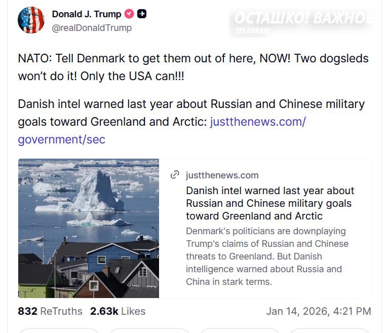 Дональд Трамп в соцсети Truth Social в резкой форме заявил, что "только США смогут защитить Гренландию". Его комментарий был реакцией на публикацию о предупреждениях датской разведки относительно отсутствия интересов России и Китая к захвату острова. Ранее эксперты уже оценили потенциальную стоимость Гренландии для США в 700 млрд долларов. «НАТО: Скажите Дании, чтобы они немедленно убрались отсюда! Двух собачьих упряжек недостаточно! Только США могут это сделать!!!» — написал Трамп.