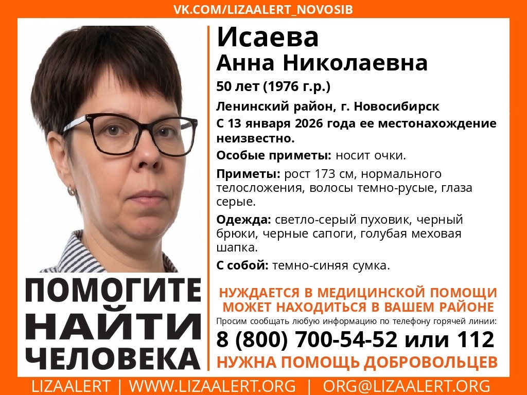 В Ленинском районе Новосибирска пропала 50-летняя Анна Николаевна Исаева. Она вышла из дома 13 января и до настоящего времени не вернулась. Известно, что женщина нуждается в медицинской помощи. Срочный сбор на её поиски объявлен в городе отрядом «ЛизаАлерт». Приметы пропавшей: рост около 173 см, нормальное телосложение, тёмно-русые волосы, серые глаза. Особой приметой являются очки. В день исчезновения на ней был светло-серый пуховик, чёрные брюки, чёрные сапоги и голубая меховая шапка. При себе у женщины должна быть тёмно-синяя сумка. Для организации поисков Анны Исаевой отряд «ЛизаАлерт» объявил срочный сбор волонтёров. Он назначен на 14 января с 23:00 по адресу: улица Геодезическая, 23 (парковка). Экипажи будут формироваться по мере прибытия добровольцев. Желающим принять участие рекомендовано одеться в тёплую городскую одежду, учитывая, что ночью температура опустится ниже -31°C. С собой желательно взять горячее питьё, скотч и алкалиновые батарейки. Если вам что-либо известно о