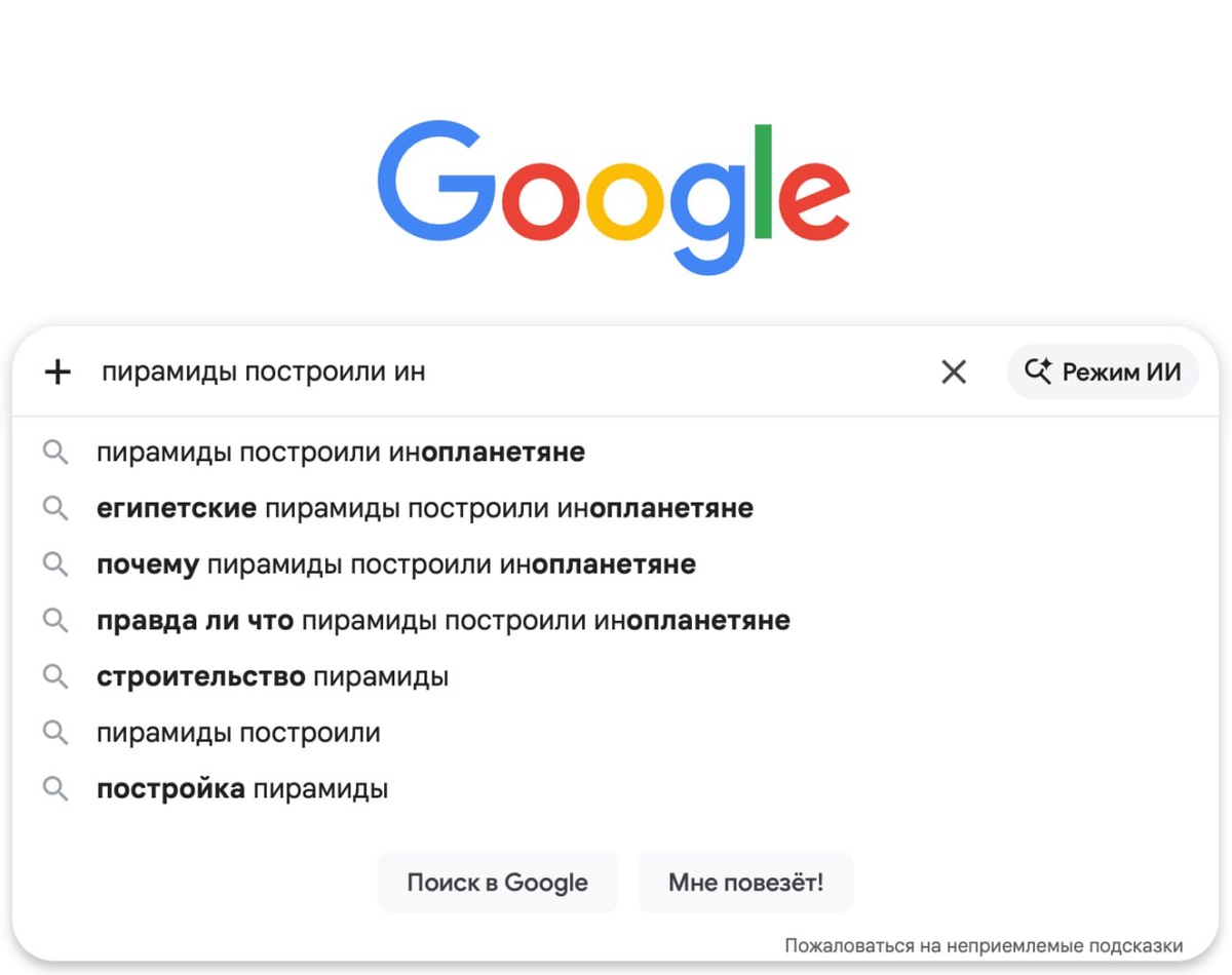 » • Посмотрите, как устроен интернет. Можно набрать в поисковике абсолютно любой запрос, спорный, дикий или неистинный. И вы всё равно получите в ответ сотни сайтов с информацией по этому запросу. Если я не специалист по истории, египтологии, инженерному делу или материаловедению, я вполне могу поверить на основании полученного по моему запросу массива данных, что люди не могли построить пирамиды сами. И приду к неверному выводу: значит, это сделали за них. Инопланетяне. Наше внимание работает примерно по такому же принципу. Если мы недовольны собой или нас не устраивает наша жизнь, одним из первых нам придет в голову вопрос: а что со мной не так? Варианты: что с моим ребенком не так? Что с моим партнером не так? И если мы проведем анализ этого вопроса, мы получим подтверждения того, что с нами и вправду не всё в порядке. Вспомнятся случаи, когда у нас что-то не получалось, не ладилось, мы не справлялись, другие люди замечали и подчеркивали наши неудачи. По сути, на нас вывалится