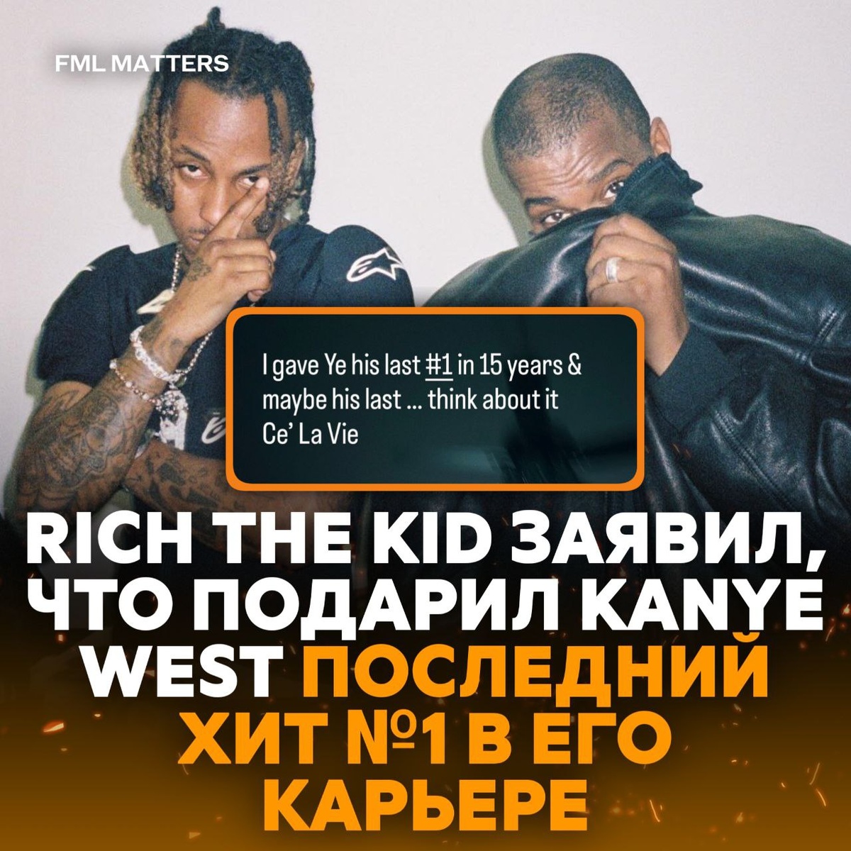 ! Рэпер сделал громкое заявление о вкладе в успех одного из главных хитов из альбома «VULTURES»: «Я подарил Йе его последний №1 хит (CARNIVAL) за 15 лет, и вообще может это последний хит. Думайте. Такова жизнь», — Rich The Kid Комментарий фаната: «Н*гер не кусай руку, которая тебя кормит😭» 💀 FML MATTERS