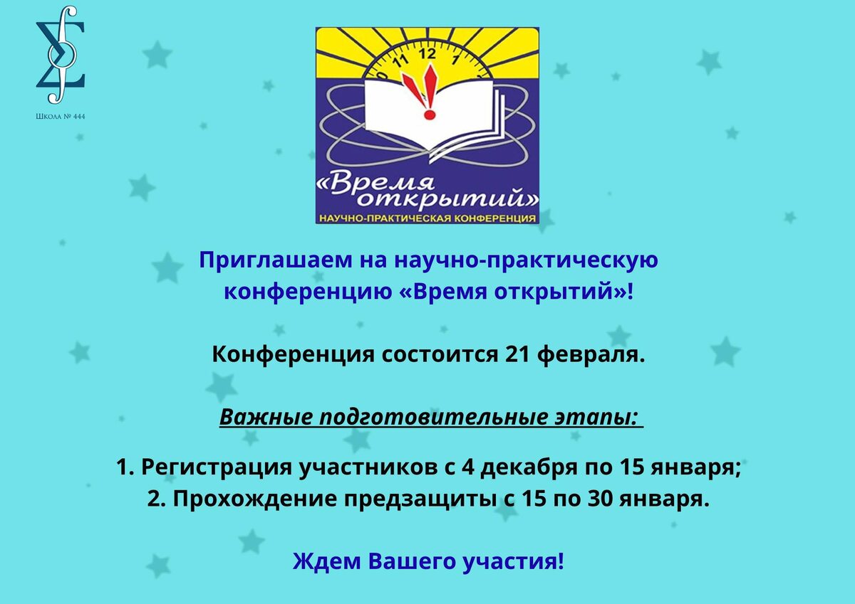 !🔬 Дорогие ребята и уважаемые родители 3-8 классов! ⚠️ Напоминаем вам, что официальная регистрация участников на научно-практическую конференцию «Время открытий — 444» заканчивается 15 января включительно. ✏️ Для подачи заявки на участие просим до конца завтрашнего дня пройти регистрацию по форме. 📖 Лучшие работы получат награды и будут опубликованы! По итогам конференции мы издадим электронный сборник материалов, куда войдут работы призёров и победителей. ❓ При возникновении вопросов обращайтесь к методисту Ирине Григорьевне Карелиной по почте: karelinaig@schmos444.ru. ✨ Не упустите шанс представить свои исследования, проекты и идеи! Подписывайся на Школу 444 в MAX #Школа444Москва #ТриЧетверки #МРСД12 #ДОНМ #ШколыКолледжиМосквы