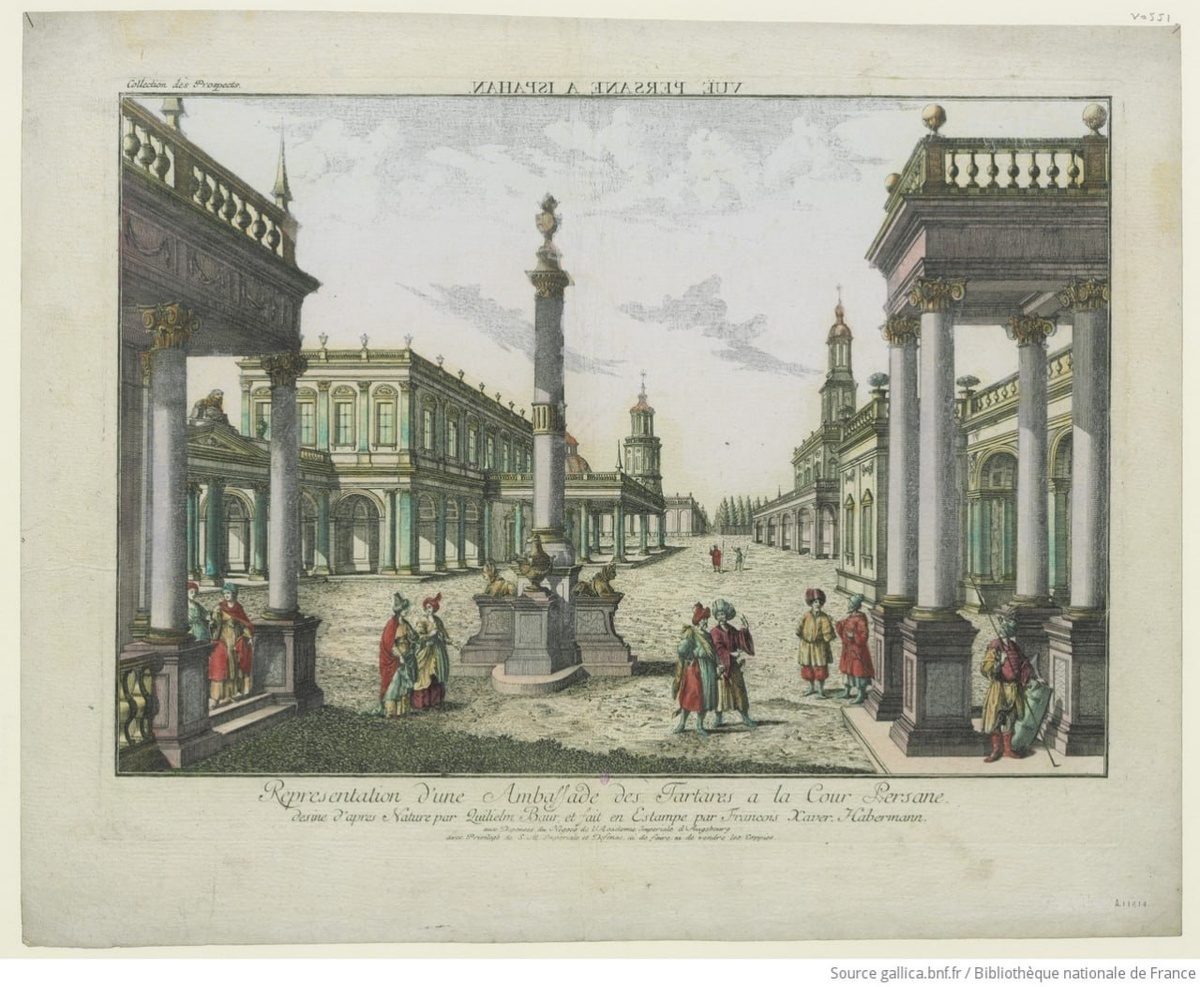 Изображение тартарского посольства при персидском дворе: [печать] / рисунок с натуры Квильелма Баура; гравюра Франсуа Ксав. Хабермана, 1775 год. Источник: https://gallica.bnf.fr/ark:/12148/btv1b69495311/f1.item.r