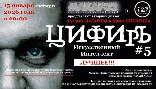 ? Дорогие друзья! Мы начинаем Новый год правильно, в хорошей компании и с пользой. 15 января в лаундже CIGAR NOIR Интеллектуальный клуб «МАКАРОВ» открывает новый год первым вечером в формате «ЦифирЪ», посвященным теме Искусственного Интеллекта. Спикер встречи — Иван Никитин, человек, который не говорит об ИИ, а создает его. Сегодня он СЕО одной из самых передовых LLM-компаний в мире (::ll Fortytwo). А его путь — это 10 лет строительства ИИ-компаний, внедрение Swarm Inference в реальное производство, руководство магистратурой в NEOM и ключевые роли в проектах от игровой индустрии до метавселенных. Формат вечера — открытый диалог главного спикера с модерацией основателя Интеллектуального клуба Руслана Макарова. Поговорим о том, что действительно работает сейчас и что ждет нас дальше в области Искуственого Интеллекта. Дата: 15 января 2026 Время: 19:00 — сбор гостей, 20;00 — начало. Место: CIGAR NOIR | Ленинградский пр-т, 35, стр. 2. Встречаемся уже завтра. Количество мест сильно ог