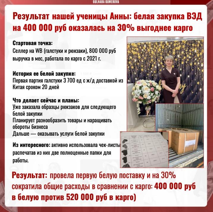 Ребят, выше мы написали пост про переплаты за белые закупки в случае работы через торговые дома и посредников. Надеюсь, теперь вам стало понятно где именно происходит переплата сотен тысяч ваших рублей и миллионов в плоскости года 💰 Но давайте теперь поговорим не только про стоимость закупки и логистики, но и про все остальное, где еще предприниматели переплачивают просто из-за недостаточности знаний 🤷🏻♀️ И даже примеров ситуаций трех наших учеников будет достаточно, чтобы уже кое-что осознать: 1️⃣ Анна сделала первую белую закупку 3 700 шт галстуков (кто думает что легкие товары невыгодны в ВЭД) сроком за 20 дней на 400 000 руб закупки и логистики в белую вместо 520 000 руб ранее в серую: 🔥 120 000 руб (30%) cэкономила уже на первой и небольшой поставке галстуков 2️⃣ Светлана сделала свою первую мультимодальную поставку 2х партий детских товаров на 9 млн руб за 28 дней: 🔥 Получила отсрочку платежа поставщику в 60 дней на первой своей белой закупке 🔥 Cэкономила 800 000 р