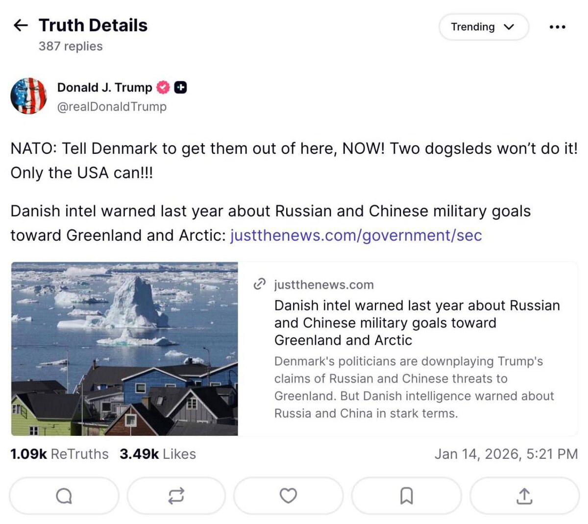 "НАТО: Скажите Дании убраться оттуда СЕЙЧАС! Пара собачьих упряжек не справятся! Только США!" — написал Дональд Трамп.