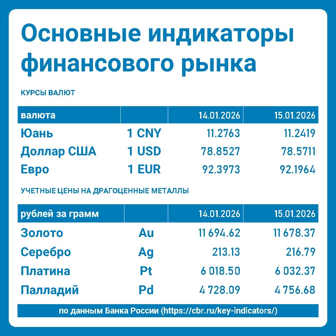 Основные индикаторы финансового рынка на 15.01.2026 #cbr_key_indicators Бизнес в Новороссийске По данным Банка России Ключевые показатели Инфляция Цель по инфляции - 4,0% Ноябрь 2025 - 6,6% Показатель инфляции отражает темп прироста потребительских цен к соответствующему месяцу предыдущего года Ключевая ставка с 22.12.2025 - 16,00% Основные индикаторы финансового рынка Курсы валют на 15.01.2026 Юань - 11.2419 Доллар США - 78.5711 Евро - 92.1964 Учетные цены на драгоценные металлы на 15.01.2026 Золото - 11 678.37 Серебро - 216.79 Платина - 6 032.37 Палладий - 4 756.68 Подписаться на Telegram канал Бизнес в Новороссийске Навигация в закрепленном сообщении 🧭 ㅤ
