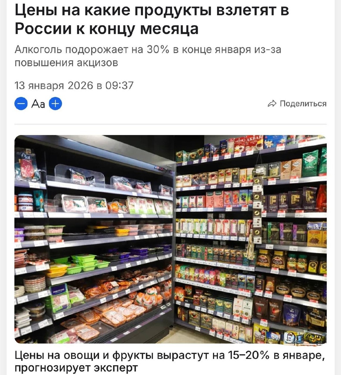 Уже к концу января в России прогнозируется существенное подорожание основных категорий продовольственных товаров и алкогольной продукции. По оценкам экспертов, цены могут увеличиться от 5% до 30%. Согласно прогнозам, наиболее заметный рост затронет: · Овощи и фрукты, чай и кофе — на 15-20%; · Мясные и молочные продукты — на 10-20%; · Крепкий алкоголь — до 30%; · Бакалейные товары (крупы, макароны, масло, консервы) — на 5-15%. Основными причинами предстоящего скачка цен аналитики называют общий рост себестоимости производства, инфляционное давление и планируемое повышение ставки НДС до 22%.