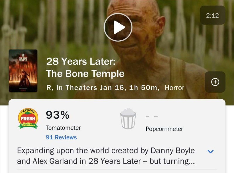 Вторая часть ожидаемой трилогии получила 93% положительных отзывов на Rotten Tomatoes, что является историческим рекордом для этой серии. Для сравнения: — «28 дней спустя» — 87% — «28 недель спустя» — 73% — «28 лет спустя» — 89% — «28 лет спустя: Храм костей» — 93% Третья часть также планируется, и в ней обещают вернуть актёра Киллиана Мёрфи. Постмейкер - автоматическое ведение канала 🤖 Анимация | СhatGPT-4 | Помощь с резюме