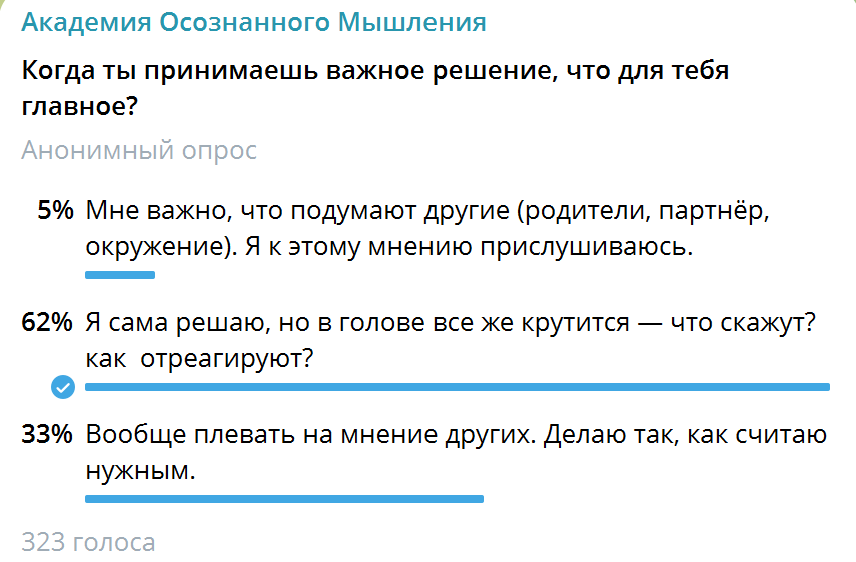 Мне кажется каждая в детстве слышала: «Вот вырастешь — будешь делать что хочешь». Ага... Ты выросла и вместо свободы заработала ловушку пострашнее родительского «нельзя». Во взрослой жизни главные тюремщики — не запреты родителей, а ожидания других, их возможное «разочарование». В своем Телеграм-канале я проводила опросы: Посмотри на результаты опросов ☝️ Для меня вырисовывается такая картина — мы все, так или иначе, заключённые в одной тюрьме одобрения. Просто сидим в разных камерах и носим разные маски. 🔘 Маска Угодницы — «Я прислушиваюсь к мнению других». Внешне — милая, удобная, правильная дочь/жена/мама/подруга. Внутри — молчаливая ярость, которая со временем превращается в болезнь. Угодница думает о других больше, чем о себе. И пока она в этой камере, она — в безопасности. А что если из нее выйти? 🔘 Маска Воина — «Я сама решаю, но...» Если ты носишь эту маску, то уже откусила кусок свободы. В твоей голове крепко засели адвокаты и прокуроры близких. Могу спорить, что ты уже уст