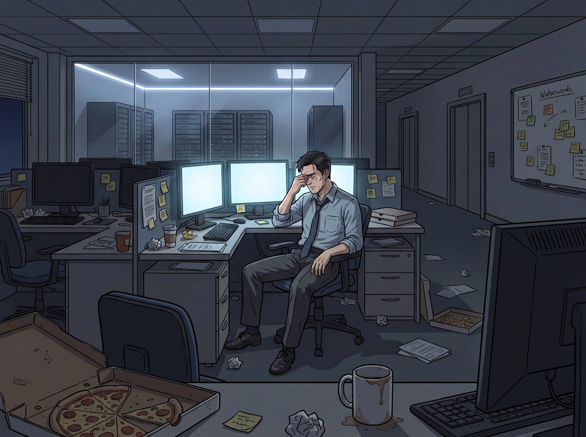 Офис жил вполсилы. Полоски светодиодных ламп гудели под потолком, как старые люминесцентные, только не мигали. В опенспейсе горели четыре монитора из пятидесяти, на кухне лениво булькал оставленный кем‑то кулер, и только серверная за стеклом светилась тревожным синим, как аквариум с радиоактивными медузами.