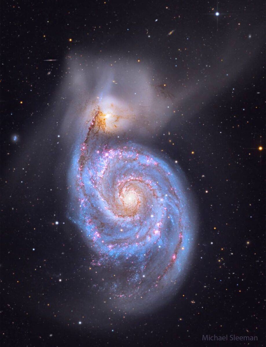 Дата: 2026-01-14 Фото: Michael Sleeman Перед вами - икона космической красоты и наглядный учебник по взаимодействию галактик. Это галактика Водоворот (M51, NGC 5194) - классическая спиральная галактика, которая находится всего в 30 миллионах световых лет от нас. Несмотря на огромный размер (около 60 000 световых лет в диаметре), M51 - одна из самых ярких и детализированных галактик на нашем небе. Её можно разглядеть даже в хороший бинокль, направив его в сторону созвездия Гончих Псов (Canes Venatici). Почему она такая идеальная? Астрономы считают, что её чёткая спиральная структура - результат гравитационного танца с меньшей галактикой-компаньоном (NGC 5195), которую видно прямо над ней. Их взаимодействие «закручивает» рукава и запускает волны звездообразования. Этот невероятно глубокий и детализированный снимок - результат цифрового сложения изображений, полученных в разных цветах за 58 часов наблюдений с телескопа в Лицзяне, Китай. M51 относится к спиральным галактикам типа Sc