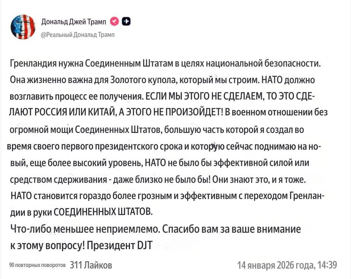 ❗️Дональд Трамп своим первым постом за сегодня сообщил, что Гренландия должна войти в состав США — «что-либо меньшее неприемлимо».