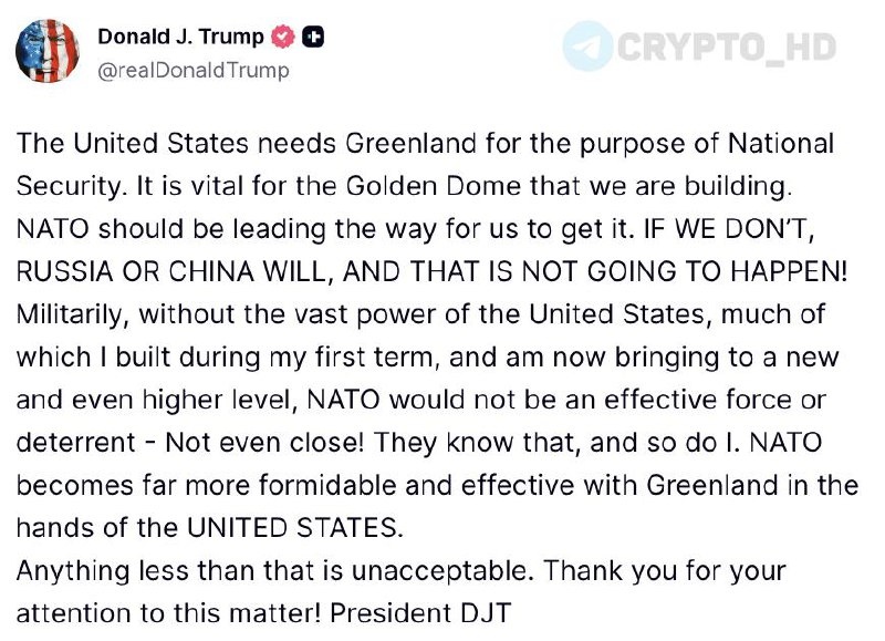 Это критически важно для «Золотого купола», который мы строим. НАТО должно возглавить усилия, чтобы помочь нам получить ее. Если мы этого не сделаем, это сделают Россия или Китай, но этого не случится. В военном плане без колоссальной мощи Соединенных Штатов, значительную часть которой я создал в свой первый срок и сейчас вывожу на новый, еще более высокий уровень, НАТО не была бы эффективной силой или сдерживающим фактором. Даже близко. Они это знают, и я это знаю. НАТО становится куда более грозной и эффективной, когда Гренландия находится в руках Соединенных Штатов. Любой вариант, отличный от этого, неприемлем. Ранее: угрозы Трампа Crypto Headlines