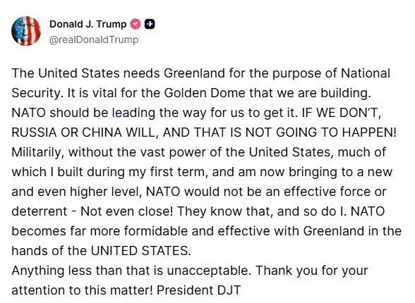 "Меньшее неприемлемо": Дональд Трамп вновь заявил, что Гренландия должна оказаться "в руках Соединенных Штатов". Он подчеркнул, что Гренландия нужна Штатам ради обеспечения национальной безопасности и "жизненно необходима" для системы ПРО "Золотой купол".