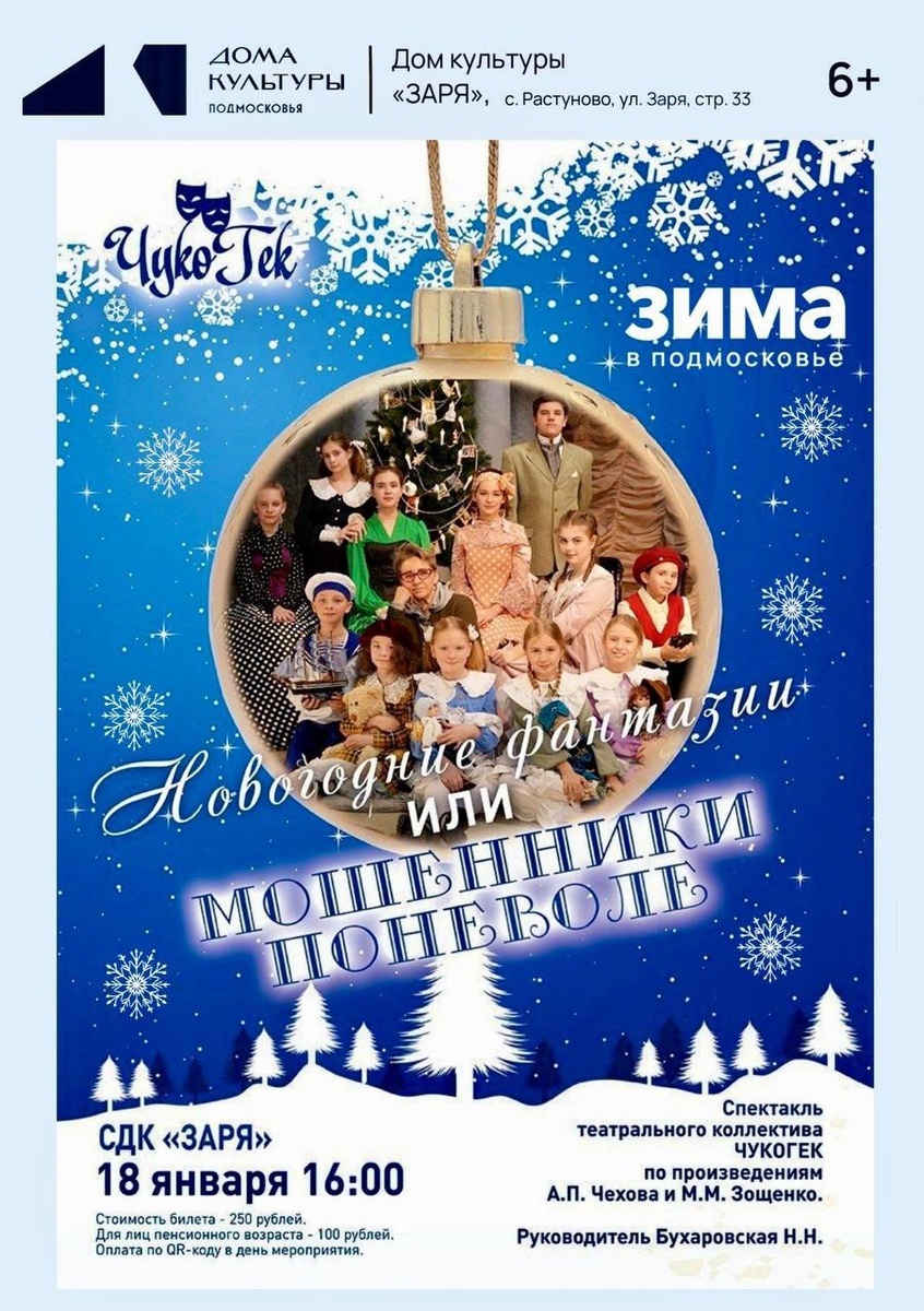 ✨ 🎄ПРИГЛАШАЕМ В ТЕАТР! 🎭 Сельский Дом культуры «Заря» приглашает жителей и гостей села Растуново на спектакль театрального коллектива «ЧукоГек»«НОВОГОДНИЕ ФАНТАЗИИ ИЛИ МОШЕННИКИ ПОНЕВОЛЕ» . Руководитель коллектива Наталья Николаевна Бухаровская. 🚫 Возраст: 6+ 📆 18.01.2026🕒16:00 🏢 Сельский дом культуры (СДК) «Заря» 📍 г.о.Домодедово, с.Растуново, ул.Заря, д.33 💰 Цена: 250 ₽ ✅ Мероприятия Домодедово https://dzen.ru/id/66f10385cc4c5a16f7b5fb02 http://vk.com/domodedovo_events http://dzen.ru/domodedovo_events