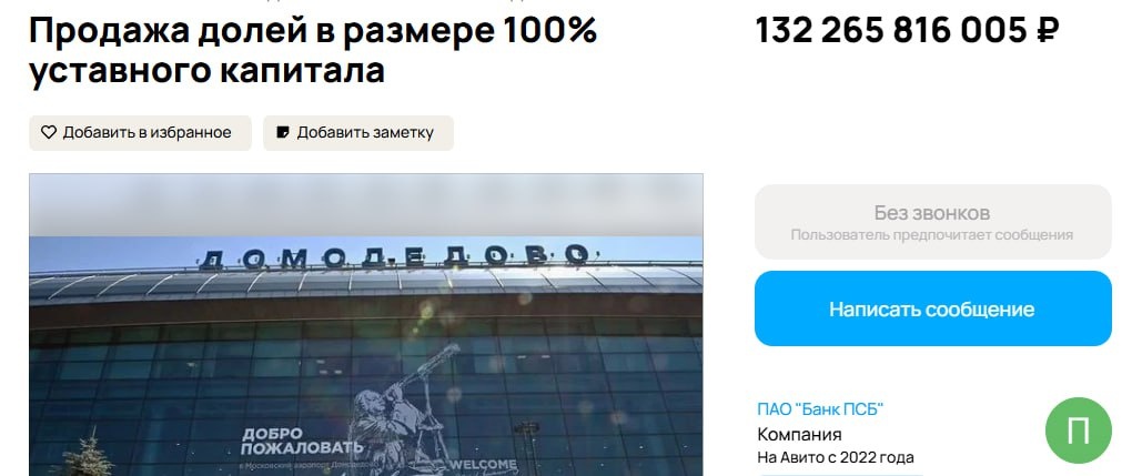 » Объявление опубликовал банк ПСБ, указав цену в 132 млрд руб. В июне 2025 года Арбитражный суд Подмосковья по иску Генпрокуратуры изъял аэропорт в пользу государства. Министр финансов Антон Силуанов заявлял, что аэропорт продадут на торгах, которые назначены на 20 января. 💬 Александр Мирской, директор бизнес-направления «Авито Бизнес 360»: На "Авито Бизнес 360" регулярно размещаются объявления о продаже крупного и нестандартного бизнеса — от заводов и гостиниц до складских комплексов и логистических хабов. Объявление о продаже аэропорта Домодедово действительно было размещено на нашей площадке. Автор объявления — официальный аккаунт банка ПСБ. Подобные лоты часто вызывают обсуждение, но для нас это часть повседневной практики. 😀 Пожалуй, лучший телеграм-канал о маркетинге