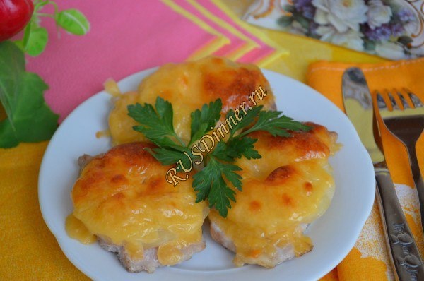 Ингредиенты: Свинина - 500 гр. (корейка или шейка) Ананас консервированный - 1 б. (кольцами) Сыр - 150 гр. Соль - 5 гр. Перец черный молотый - 5 гр. Источник: https://rusdinner.ru/page/mjaso-zapechennoe-s-ananasami