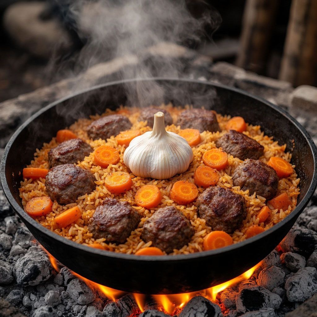 Что понадобится: баранина или говядина — 1 кг; рис длиннозёрный — 800 г; морковь — 4 шт.; лук — 3 шт.; чеснок — 1 головка; барбарис сушёный — 1 ст. л.; зира — 1 ч. л.; куркума — ½ ч. л.; растительное масло — 150 мл; соль, перец — по вкусу. Как готовить: В казане разогрейте масло, обжарьте куски мяса до корочки. Добавьте нарезанный лук, жарьте до золотистого цвета. Положите морковь соломкой, тушите 5–7 мин. Всыпьте специи, барбарис, соль, влейте воду (чтобы покрыла содержимое). Томите под крышкой 40 мин. Промойте рис, выложите сверху, воткните головку чеснока. Долейте горячей воды (на 1,5–2 см выше риса), готовьте без крышки, пока вода не впитается. Уменьшите огонь, накройте крышкой и томите 20–25 мин. Перед подачей аккуратно перемешайте. Почему вкусно: Настоящий плов с дымком — аромат и вкус, которые невозможно забыть!