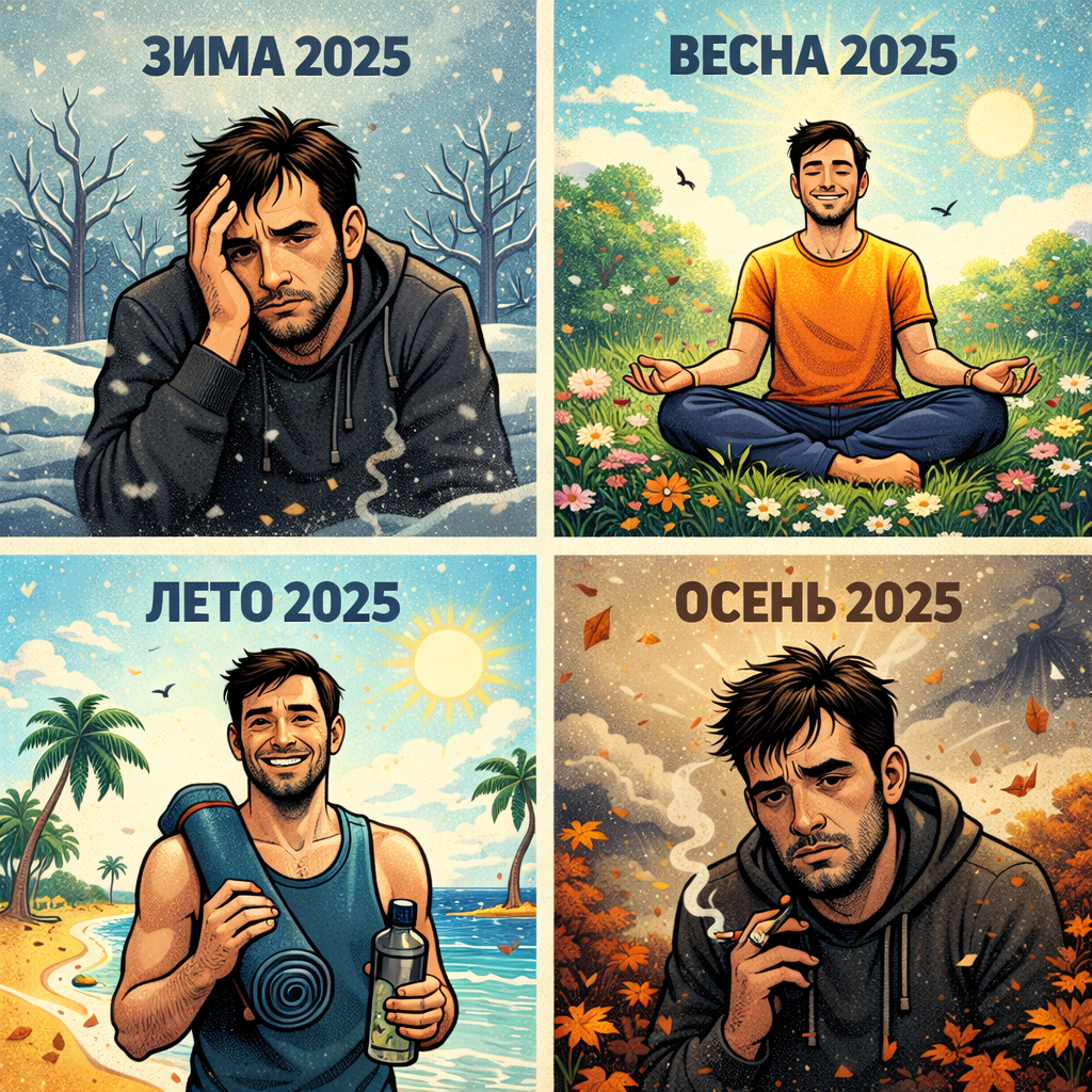 2025-й был для меня годом больших изменений и испытаний. Я бросил алкоголь и курение, начал эксперименты с физическими практиками и саморазвитием, развивал творческие проекты. Но к концу года случилось то, чего я не мог контролировать — состояние ухудшилось, и я вновь столкнулся с депрессией. Этот пост — мой личный отчет о годе: что сработало, что разрушилось и как я планирую двигаться дальше.