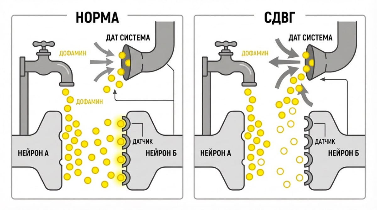 Представь машину, в которой полный бак бензина, но зажигание не работает. Ты сидишь за рулём, знаешь куда ехать, хочешь ехать — а двигатель не заводится. И ты сидишь Час. Два. День Ненавидишь себя за то, что просто не можешь взять и поехать. Со стороны это выглядит как лень. Изнутри — как паралич. Так вот. Дофамин — это не бензин. Дофамин — это зажигание. Его годами называли гормоном счастья. Типа: сделал дело — получил дофамин — стало приятно На самом деле всё наоборот. Дофамин выделяется ДО действия. Это он запускает движение. Он говорит мозгу: "поднимай нашего чувака, будет классно, если он это сделает" Без дофамина ты можешь хотеть. Понимать. Планировать Но не начинать Почему у некоторых зажигание барахлит? Посмотри на картинку Слева — норма. Нейрон А (кран) выдаёт дофамин. Большая часть долетает до Нейрона Б (датчика). Сигнал проходит. Ты встаёшь и делаешь. Справа — СДВГ. Тот же кран, то же количество дофамина. Но ДАТ-система (условный пылесос) работает слишком жадн