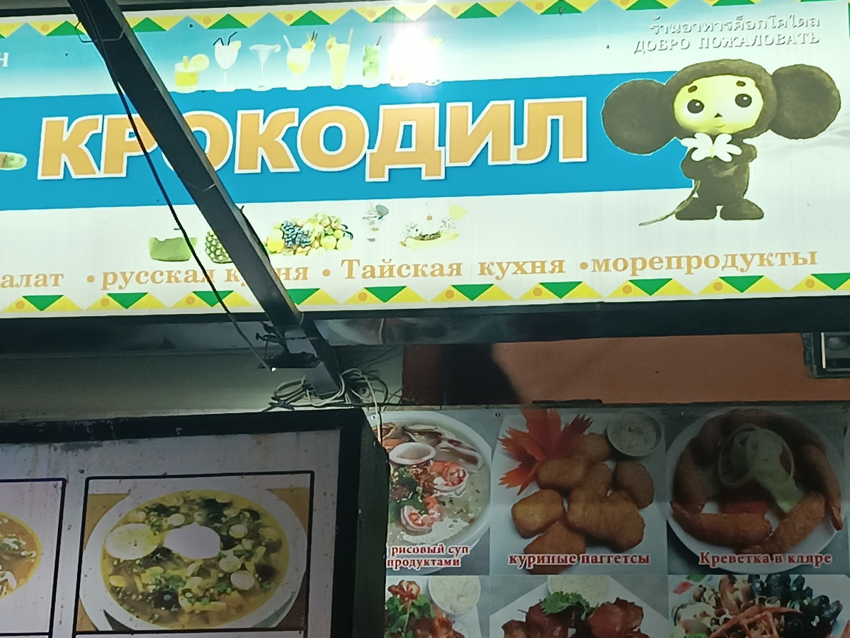 На Джомтьене на улице Soi Welcome у ночного рынка Yaimak Market (Маяк) располагаются два известных старых ресторана для туристов: "Белый попугай" (в прошлую зимовку мы действительно видели настоящего красивого большого белого попугая на входе) и напротив - "Крокодил". В обоих часто на экране телевизоров - мультфильм "Маша и медведь".
