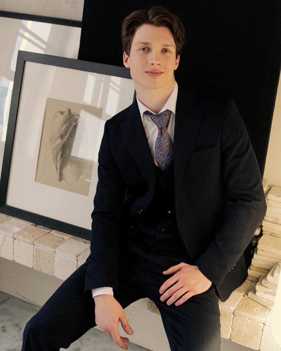 Черный костюм часто считают слишком официальным, но посмотрите на эти кадры. Правильные акценты превращают его в мощный инструмент стиля. Разбор образа: 🔹 Акцентный галстук Узор в голубых и медных тонах — идеальный способ «разбавить» строгость черного. Это добавляет образу жизни и индивидуальности. 🔹 Сила жилета Жилет делает силуэт четким и собранным. Это ваш «доспех», который позволяет выглядеть безупречно, даже если вы сняли пиджак. 🔹 Белоснежный контраст Белая рубашка рядом с черной тканью создает самую сильную визуальную линию. Она освежает лицо и служит идеальным фоном для аксессуаров. 💡 совет: Для черного костюма выбирайте матовые ткани, как на фото. Они выглядят благороднее и дороже глянцевых материалов.