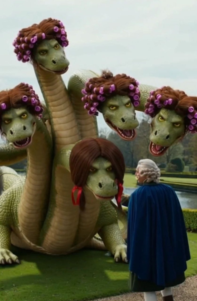 "Мадам," – сказал он Гидре, – "позвольте мне помочь вам с прической. Уверен, что с таким количеством голов вам нелегко поддерживать порядок."