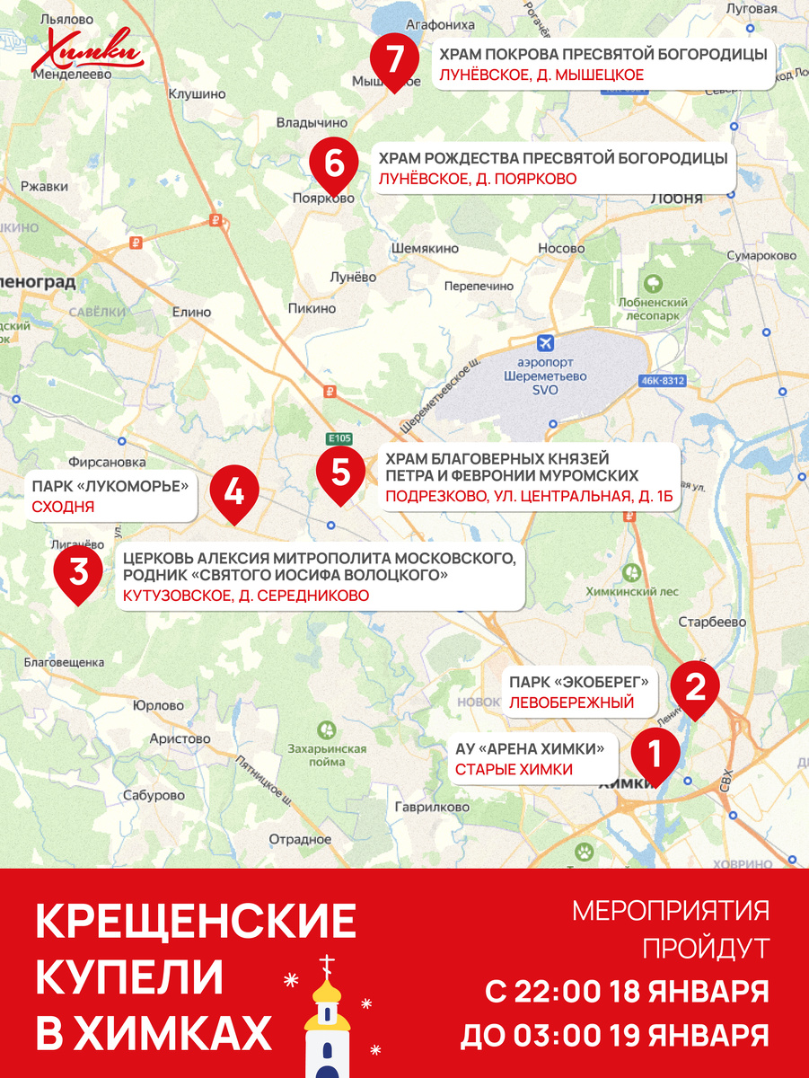 Центральной локацией традиционно станет площадка у «Арены Химки». Здесь обустроят мужскую, женскую и тёплую купели, оборудуют удобные подходы, тёплые раздевалки и праздничное оформление.