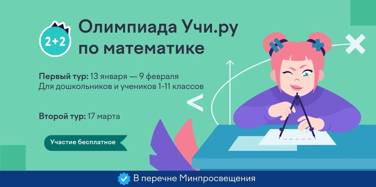 📣Приглашаем учеников 1–11 классов начать новый год вместе с Учи.ру — через участие в *бесплатной всероссийской олимпиаде по математике*. ✔️Состязание входит в перечень олимпиад Минпросвещения России на 2025/26 учебный год. ❗️Достижения и результаты победителей могут быть внесены *в государственный информационный ресурс* о лицах, проявивших выдающиеся способности. Олимпиада проводится в два этапа: — основной тур пройдет онлайн по всей России 📎1 тур 13 января — 9 февраля включительно 📎2 тур состоится 17 марта в очном формате. 👍Игровые задания тренируют арифметические навыки, развивают логику, пространственное мышление и способствуют росту интереса к изучению математики. ✨Все участники получат сертификат, грамоту или диплом — в зависимости от результата. Чтобы принять участие в соревновании, переходите по ссылке ➡ https://vk.cc/cTl05Z #ДОНМ #Школа1400