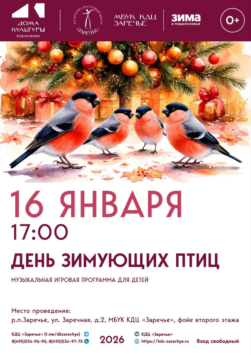 ЗИМУЮЩИХ ПТИЦ"! 🌲 Ведущая программы - руководитель танцевального ансамбля "Лучики солнца" Сысоева Людмила Борисовна. В честь всероссийского экологического праздника участников ждут тематические игры, танцы и другие развлечения. 🎉🐤 Ждем ребят дошкольного возраста в пятницу в фойе второго этажа! Начало в 17:00 #кдцзаречье #культура_одинцовский #культуравзаречье #культура #ОГО #культураОГО #мероприятия #ДеньЗимующихПтиц