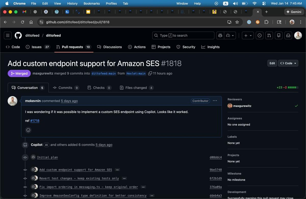 Есть такая софтина https://www.dittofeed.com/ которая нужна для crm-макретинга (email рассылок и т.п.) Таких решений довольно много и честно говоря стоят они немало. Поэтому попрыгав по разным сервисам, мы в конце концов пришли к тому, что ладно, пусть будет меньше функций, но зато open source, который можно поставить к себе если что. Дитофид как раз оказался таким решением. Не единственным, но помимо подходящей функциональности я обращаю внимание на технологии и перспективы. В данном случае там юзаюется как по мне очень неплохой сетап на ноде (ts + drizzle + fastify). Когда начали пользоваться, вылезло много разных штук, которые хотелось бы добавить/улучшить и среди них была возможность задавать кастомный урл Amazon SES для отправки писем. Как и S3 их апишка по сути стандарт в индустрии и кроме амазона так отправлять почту можно почти в любом облаке. Но поскольку там не было возможности менять адрес, то и воспользоваться этой штукой мы не могли, а настроили отправку через обычный SMT