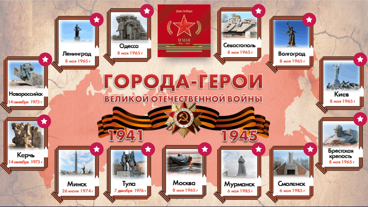 Звёздный час «Герои Великой Отечественной войны» 1 тур. Города- герои. Москва, Одесса, Волгоград, Тула, Ленинград, Новороссийск, Брест, Севастополь. 1. Назовите город-крепость (Брест). 2. В каком городе находится знаменитый «дом Павлова»? (Волгоград) 3. Непреступным был он и остался В боевые славные года. Никому наш город не сдавался, Никому не сдастся никогда! 1941г. Михаил Светлов Назовите этот легендарный город (Ленинград). 4. Назовите город, прославивший себя не только в годы Великой Отечественной войны, но и Крымской войне? (Севастополь) Наши герои Сержантов, Селиванов, Берест, Ерёменко, Лелюшенко, Штахановский, Мадоян, Клочков, Хлобыстов. 1. Назовите, кто был в числе водружавших знамя над Рейхстагом? (Алексей Берест) 2. «Велика Россия, а отступать некуда. Позади Москва!» Кому принадлежат эти слова? (Василий Клочков) 3. Наш земляк, дважды Герой Советского Союза, принимавший участие в окружении и ликвидации армии Паулюса под Сталинградом? (Д.Д.Лелюшенко) 4. В ночь на 8 февраля