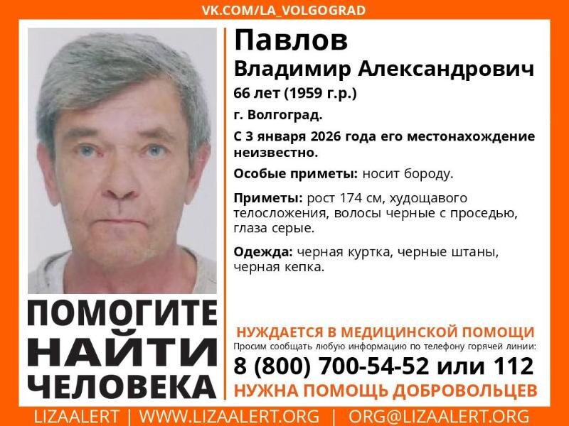 В Волгограде объявлены поиски 66-летнего Павлова Владимира Александровича, о местонахождении которого ничего не известно с 3 января. Мужчина, 1959 года рождения, нуждается в постоянной медицинской помощи, что делает его исчезновение особенно тревожным.