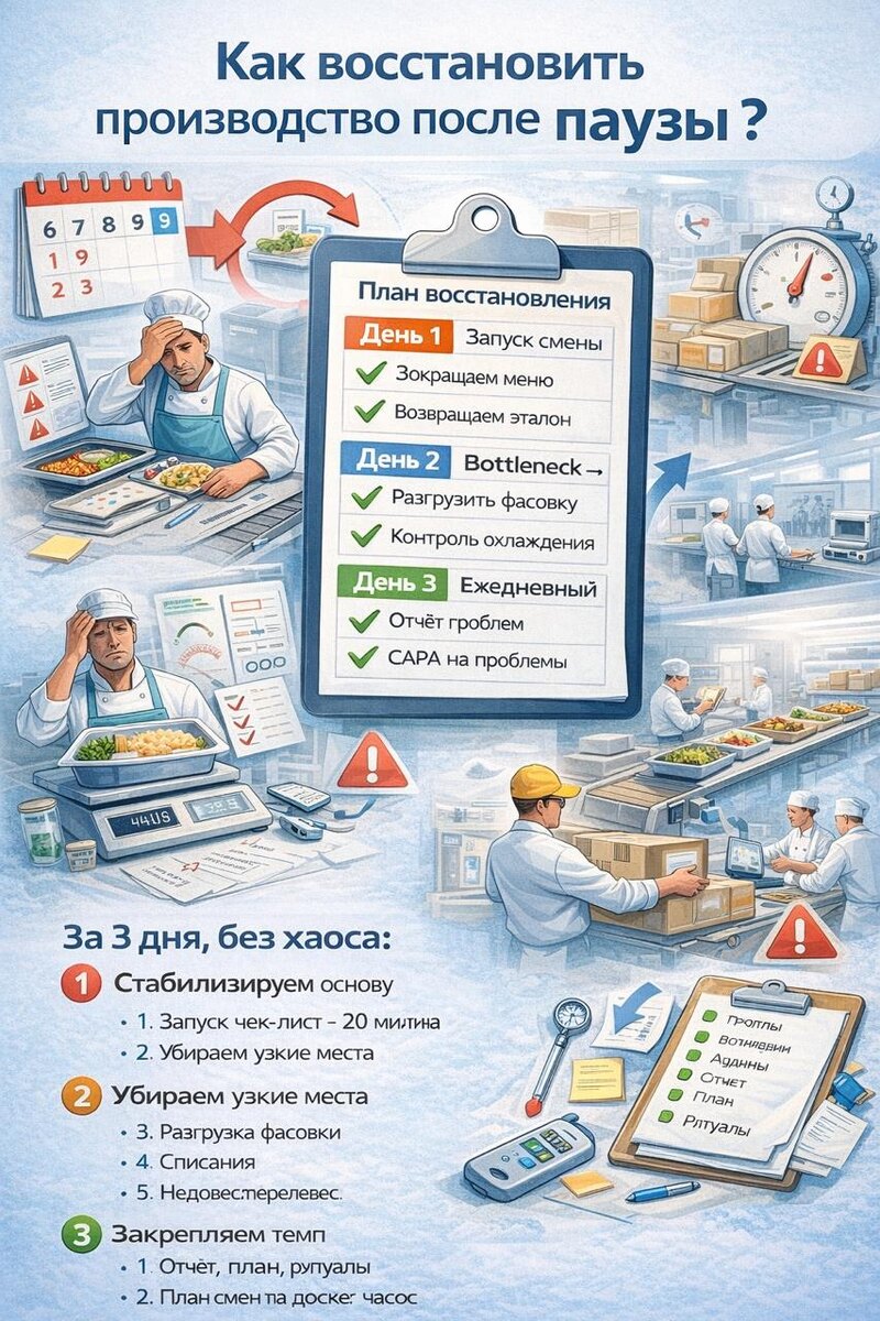 ” Плановая пауза на праздники закончилась — и начинается классика: — темп ниже, чем был — вкус/выход “гуляет” — брак в фасовке — склад внезапно не готов — в смене нервяк, всё “срочно” Это нормально: пауза ломает ритм, а система вскрывает слабые места. Ниже — как восстановить процессы за 3 дня, без героизма и круглосуточных смен. Почему после паузы всё едет (5 причин) 1. Сбился стандарт: люди делают “как помнят”, а не “как надо” 2. Склад и сырьё: неполные остатки, разные партии, замены “на ходу” 3. Оборудование: простои → мелкие проблемы, калибровки, чистка “вроде была” 4. Планирование: заказы уже пошли, а производственный план ещё не вернулся 5. Команда: не все в форме, новые/подменные люди, потерянный темп План восстановления: “72 часа без хаоса” День 1 — Стабилизируем основу ✅ 1) Запуск смены по чек-листу (20 минут до старта) ✅ 2) Урезаем меню до “ядра” • оставляем 10–20 SKU, которые дают основной объём/маржу ✅ 3) Возвращаем эталон • 3–5 ключевых блюд: техкарта + фотоэт