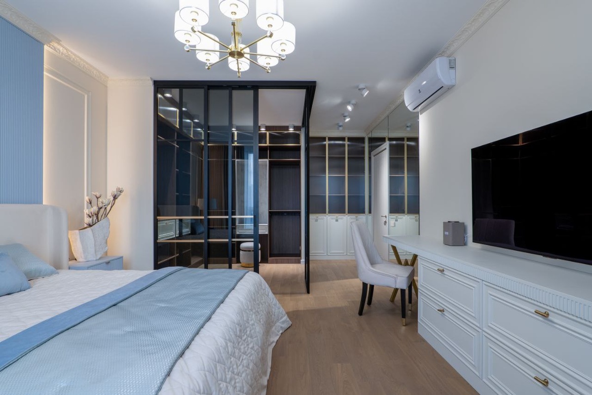 ! 🏆В этой работе нам хотелось не просто отделить гардеробную, а создать лёгкую, воздушную архитектуру внутри спальни. И мы получили главную героиню спальни!🥇 Согласитесь, она притягивает к себе всё внимание. 🌀А еще мы сотворили механику, которая восхищает: плавное движение за счет синхронногл механизма открывания, тихий доводчик на закрывание,чувство безупречной точности - при стыке нет никаких зазоров. ♣️Серое полупрозрачное стекло в строгом чёрном профиле. Золотые делители на дверцах — тот самый штрих, который соединяет перегородку с общим дизайном. Все элементы здесь ведут диалог - свет, цвет, металл. 💬Главная мысль этого проекта в том, настоящая роскошь — не в избытке, а в точности. В том, чтобы каждая деталь, даже техническая, работала на эстетику и настроение☺️ ❗️Создадим ваше идеальное пространство, где продумано всё — от доводчика на двери до золотого делителя❗️ Контакты для связи👇 📱What's app 📱Сайт ☎️+74956447226