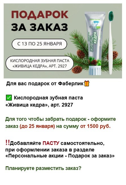 🔸🔸🔸🔸🔸🔸🔸🔸 🔸🔸🔸🔸🔸 🔸🔸🔸🔸🔸🔸🔸🔸 5️⃣5️⃣ консультантов в моей Личной группе получили в подарок Кислородную профилактическую зубную пасту «Живица кедра», стоимостью (по каталогу) 149 руб.! А это 🔸🔸🔸🔸 руб. 💰 компания вложила в мой бизнес!!!🥳 Люблю Фаберлик 🔸 📢 С 13 по 25 января некоторые покупатели, которые сделают заказ от 1500 руб. (в ценах каталога) получат в подарок (за 1 руб) Кислородную профилактическую зубную пасту «Живица кедра», арт. 2927. 🎁Подарок доступен при оформлении заказа в разделе «Персональные акции – Подарок за заказ». 🟡 Участники акции отмечены желтым цветом и буквой «А», в отчете «Информация по личной группе». 🌐 Информация по странам-участницам и пороговым суммам в национальных валютах доступна https://disk.360.yandex.ru/i/SQQYkL7qVLu3TQ ⁉️ Что пишем счастливчикам⬇️ (Выбирайте страны, которые есть в вашей структуре) {Здравствуйте|Приветствую вас|Добрый день}! В этом каталоге компания Фаберлик приготовила для вас подарок🎁 🔥Предложе