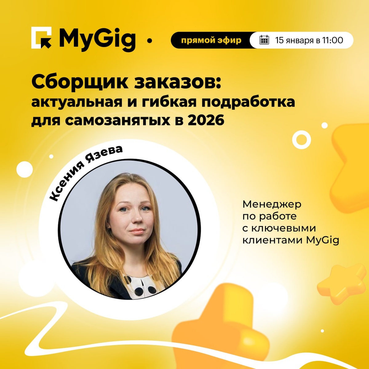 : «Сборщик заказов: актуальная и гибкая подработка для самозанятых в 2026 году» 🗓 15 января в 11:00 по МСК приглашаем вас на онлайн-встречу с Ксенией Язевой, менеджером по работе с ключевыми клиентами MyGig Этот вебинар будет особенно полезен, если вы: 🔸 хотите попробовать себя в роли сборщика 🔸 ищете гибкую подработку без опыта 🔸 или просто хотите понять, чего ожидать от этой профессии — как проходит смена, сколько можно заработать и с чего начать Вы узнаете: 🔹 Почему спрос на сборщиков растёт и будет ли эта работа востребована в ближайшие годы? 🔹 Что нужно знать перед стартом: плюсы, особенности и на что обратить внимание? 🔹 Как устроена оплата: сдельная и почасовая — в чём разница и как выбрать подходящий формат? 🔹 На реальных примерах через MyGig — как ваш доход зависит от темпа и качества работы Регистрация уже открыта — успейте занять место!