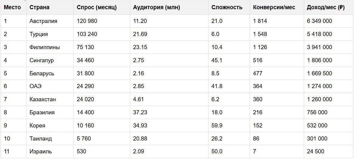 🌍 Обычно, чтобы понять, куда выходить первым, делают десятки слайдов и роются в отчётах. Я пошёл проще — собрал всё в одной таблице через Ahrefs + Excel. Теперь сразу видно, где есть спрос, а где тишина 👇 🧩 Что внутри: Volume (мес) — онлайн‑спрос из Ahrefs (коммерческие запросы). Целевая аудитория — активное население: интернет + онлайн‑покупки (по открытым данным). Difficulty — насколько сложно зайти по ключам. Доход/мес = Volume × 1.5 % × 3 500 ₽ 📊 Итог по 11 странам: 🇦🇺 Австралия — топ по спросу (6.3 млн ₽/мес) 🇹🇷 Турция — чуть меньше Volume, но ЦА почти ×2 🇵🇭 Филиппины — быстро растут 🇧🇾 Беларусь и 🇦🇪 ОАЭ — середнячки, но Беларусь по Volume выше 💡 Формула универсальная: для любой ниши и продукта. Хочешь шаблон — напиши «⚙️ формула», скину Excel 👇