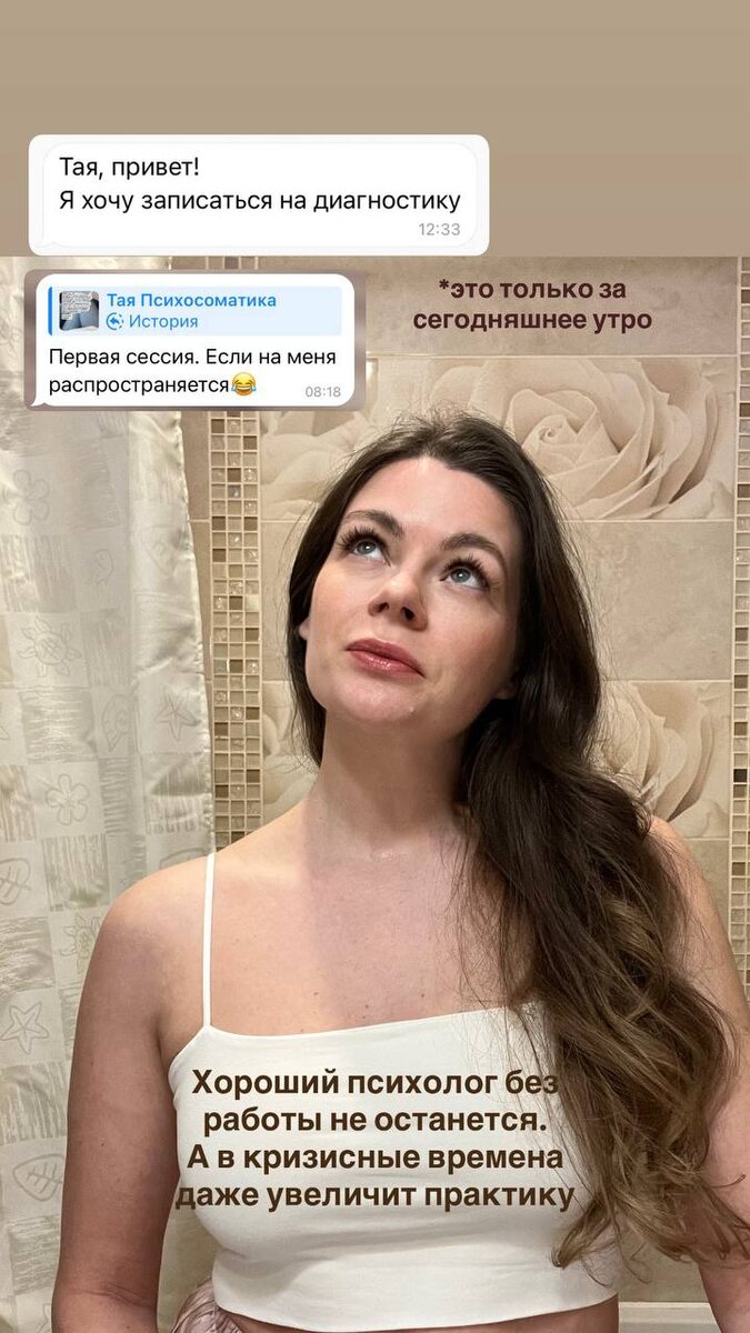 … Анализы «в норме», а жить тяжело. Вес не уходит, энергии нет, сон нарушен. Тело вымотано вечным выживанием. Вы пробовали диеты, бады, спорт, врачи говорят: «всё хорошо», но внутри усталость, тревога, ощущение, что “что-то не так”. Я работаю с этим уже много лет. Не как врач, а как психолог, который понимает: тело реагирует на то, что мы не прожили, стресс, одиночество, страх, обесценивание, границы. Сейчас я приглашаю вас на первую консультацию за 1 500 ₽ (вместо 5 000 ₽). Это 50 минут, где мы: → разберём, что происходит с вашим телом и жизнью, → поймём, почему симптомы не уходят, → и вы уйдёте с чётким пониманием: есть решение. Места ограничены. Если чувствуете отклик, пишите в ЛС: «Первая сессия». С теплом, Таисия 💛