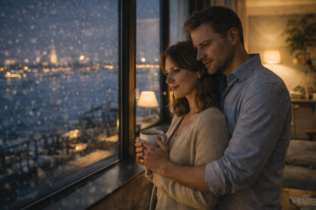 Они сидели обнявшись, пока за окном не стемнело окончательно. Снег всё падал — мягкий, пушистый, укрывающий город белым одеялом.