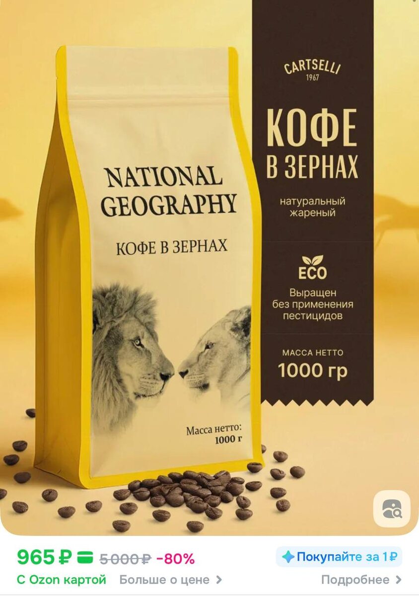 Кофе в зернах натуральный жареный Cartselli National Geography 1 кг
