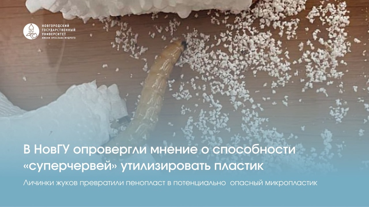 Ученые НовГУ экспериментально проверили, насколько крупные личинки жука Zophobas morio (те самые, что любят снимать в фильмах ужасов), могут поедать пенопласт. Оказалось, что никакого химического разложения не происходит. Вместо этого насекомые просто дробят материал, превращая его в микроскопические частицы. Вывод важен для оценки реального потенциала использования насекомых в переработке пластика, а также для понимания рисков, связанных с накоплением микропластика в экосистемах.