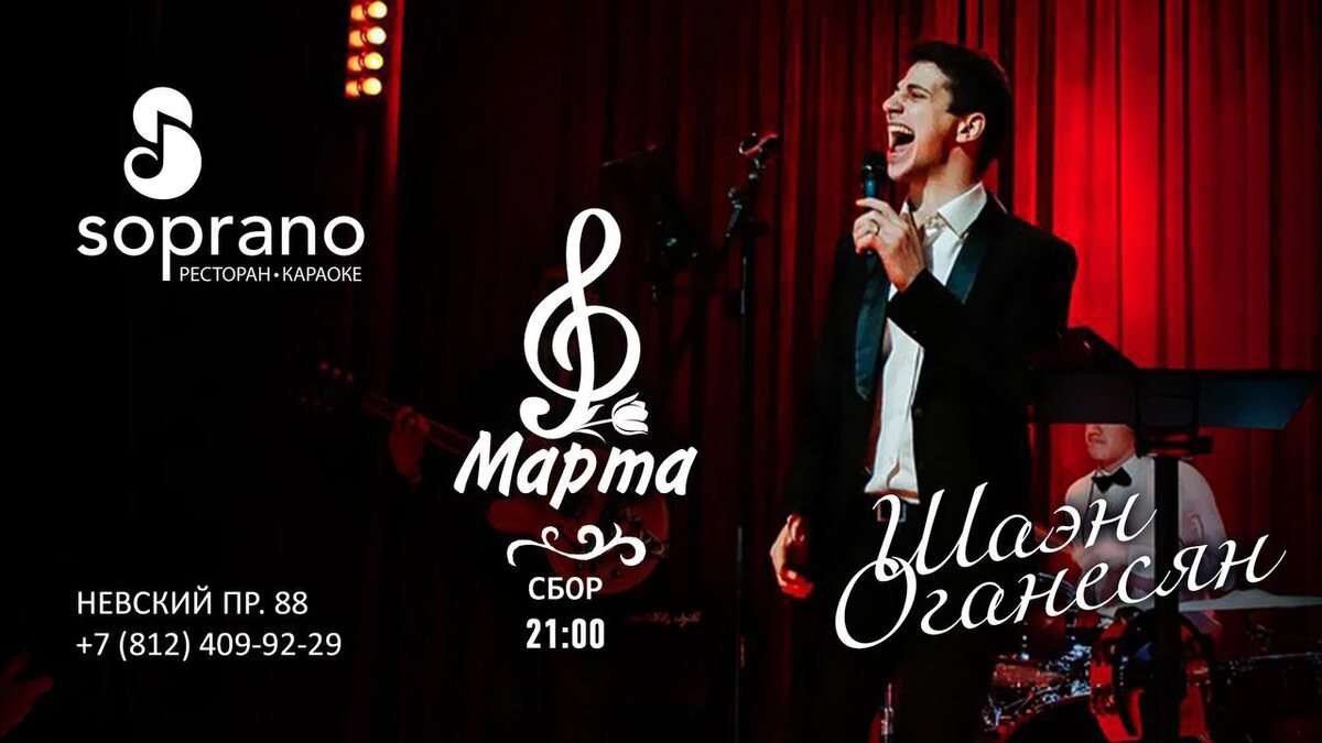️🔠🌷 ШАЭН ОГАНЕСЯН В SOPRANO Финалист 7 сезона шоу «Голос» и участник проекта «Браво! Бис!». Поэт, композитор, автор и исполнитель собственных песен. Его проникновенный вокал, природное обаяние и тонкий юмор создают атмосферу высокого качества и тёплой интеллигентности. В этот вечер — только живой звук, отборный репертуар и уютный праздничный формат. Отмечаем Международный женский день в караоке-клубе Soprano! 🌷 Сбор гостей: в 21:00 Начало: в 23:00 Ждём вас на особенный весенний вечер! CLUBSOPRANO.RU +7(812)409-92-29