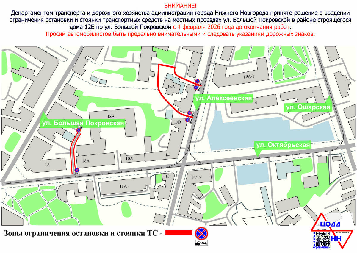 В Нижнем Новгороде с 4 февраля 2026 года будет ограничена остановка и стоянка транспорта на местных проездах улицы Большой Покровской. С 4 февраля 2026 года в Нижнем Новгороде вводятся ограничения на остановку и стоянку транспортных средств на местных проездах улицы Большой Покровской в районе строящегося дома №12Б. Как сообщили в профильных службах, меры приняты для обеспечения беспрепятственного проезда большегрузной техники к строительной площадке. Ограничения будут действовать до завершения строительных работ. Водителей просят заранее убрать автомобили за пределы зоны ограничений. Транспортные средства, оставленные с нарушением требований дорожных знаков, будут эвакуированы. Информацию о перемещенных автомобилях можно получить по телефону справочной службы: 417-17-07. Автомобилистам рекомендуется заранее ознакомиться с новой схемой парковки, быть внимательными и строго следовать установленным дорожным знакам. Фото: ЦОДД НН Ранее мы рассказали о том, что движение транспорта на улице