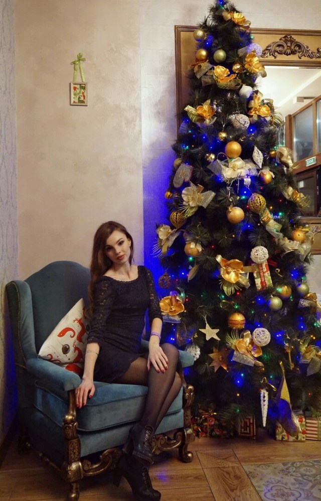 В уютной комнате, наполненной предновогодней атмосферой, сидит молодая женщина. Её поза изящна и непринуждённа — она словно воплощение спокойствия и лёгкой задумчивости. Чёрное платье облегает фигуру, подчёркивая её стройность и грацию, а тёмные колготки придают образу утончённость. Лёгкая улыбка трогает уголки её губ, будто она хранит в себе маленькую, никому не известную тайну.